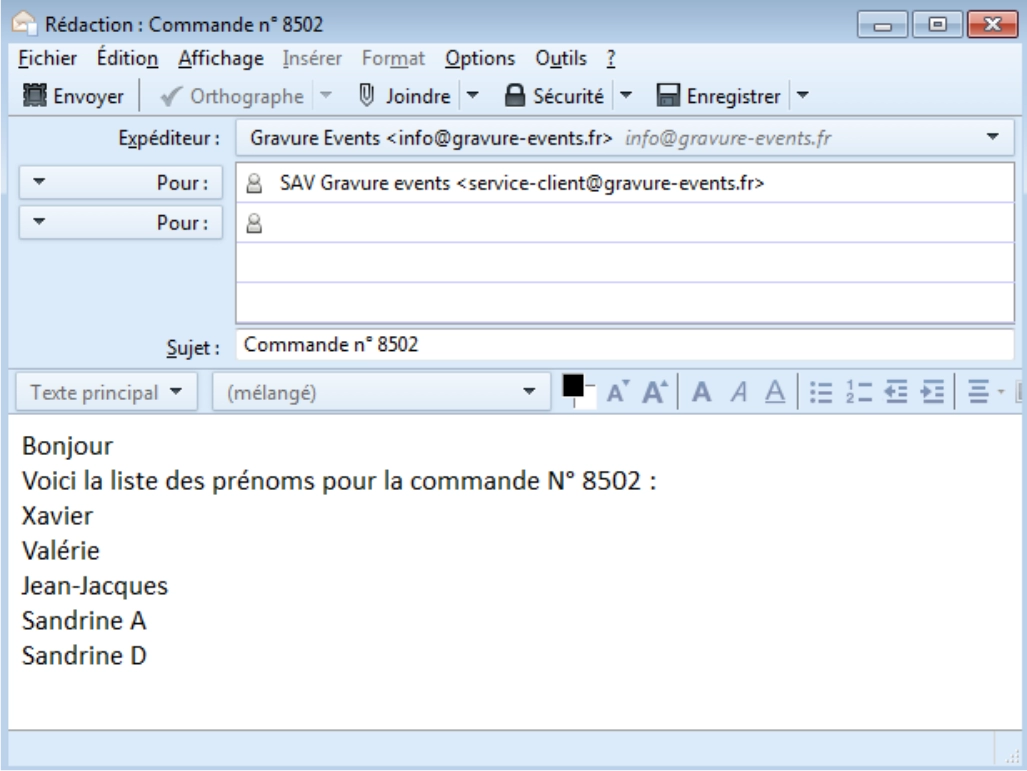 Une fois votre commande passée et réglée, merci de nous transmettre votre liste de prénoms par mail avec la même présentation que ci-dessous :