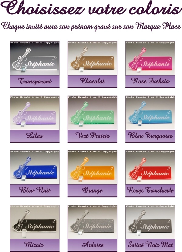 Commande faite pour mon mariage sur le thème de la musique .... marque place très joli avec la guitare et l'écriture est très bien faite ... Le colis est très bien emballé et chaque marque place dans son étui .... Très contente je recommande
